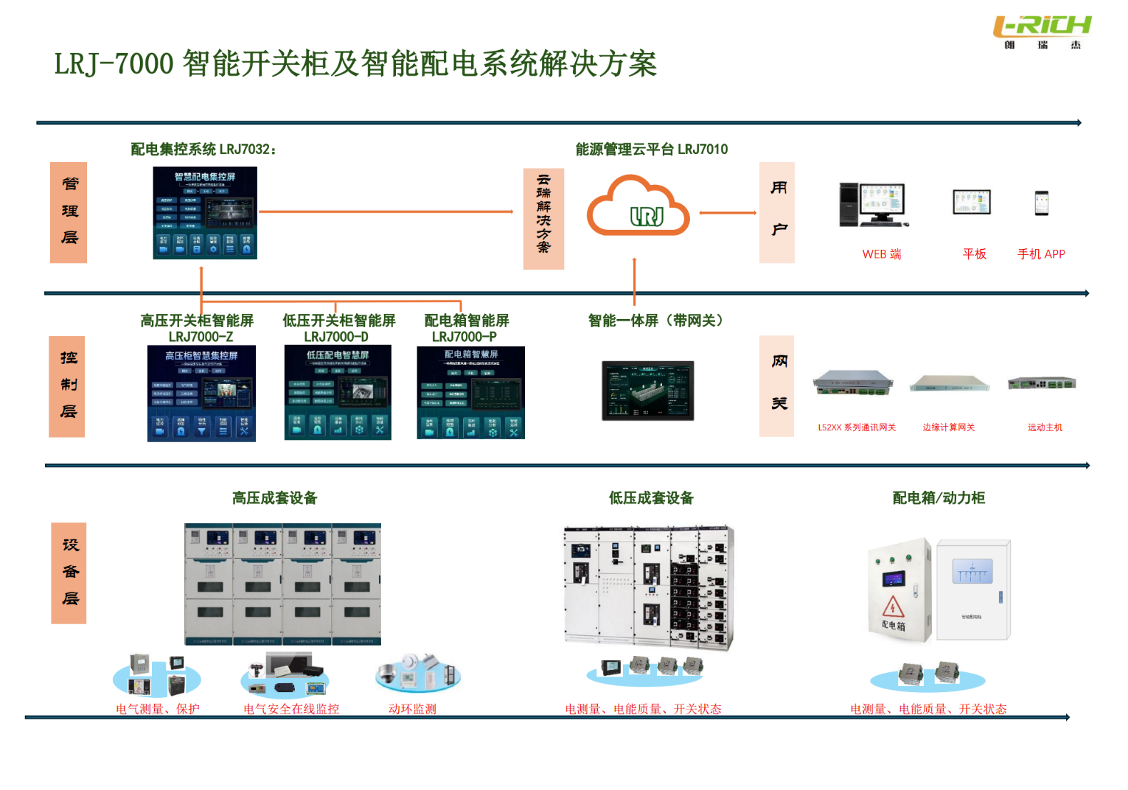 LRJ-7000系列智能開關(guān)柜及智能配電系統(tǒng)解決方案,從底層感知元件、傳感器等智能化集成、向上擴(kuò)展到智能開關(guān)柜四可(可視、可監(jiān)、可控、可管)、從站房配電監(jiān)控到云運(yùn)維遠(yuǎn)程管理,一改傳統(tǒng)監(jiān)控系統(tǒng)從上自下的架構(gòu)建設(shè)思維,重上層數(shù)據(jù)展示效果、輕底層數(shù)據(jù)采集智能化基礎(chǔ)的問題,解決了以往頭重腳輕、流于形式的智能化數(shù)字化,讓解決方案真正落地生根,解決成套設(shè)備生產(chǎn)企業(yè)產(chǎn)品智能化技術(shù)短板、快速建成自己的智能化開關(guān)柜系統(tǒng)產(chǎn)品,為終端用戶切實(shí)解決各類設(shè)備運(yùn)行維護(hù)、安全用用痛點(diǎn)與電力能源管理難題。