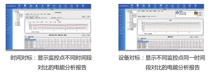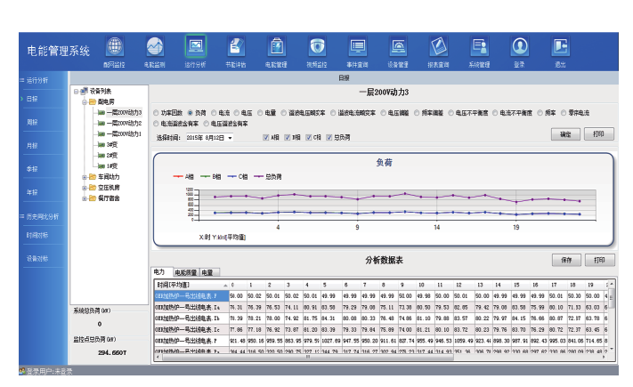 運(yùn)行分析為管理者提供設(shè)備日、月、年的電能分析報(bào)告,報(bào)告以曲線、表格的形式展示,并從電力、電能質(zhì)量和電量三個(gè)方面進(jìn)行數(shù)據(jù)對(duì)照,指導(dǎo)電能管理者分析設(shè)備配電網(wǎng)絡(luò)的運(yùn)行情況