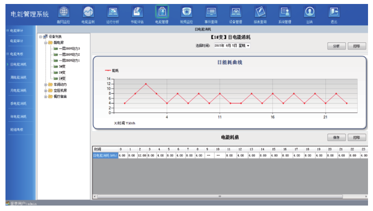 電能考核:為管理者提供設(shè)備日、周、月、季、年的電能消耗報(bào)告,報(bào)告以曲線、表格的形式展示,為電能管理者分析設(shè)備配電網(wǎng)絡(luò)消耗的運(yùn)行情況,了解設(shè)備的能耗狀況
